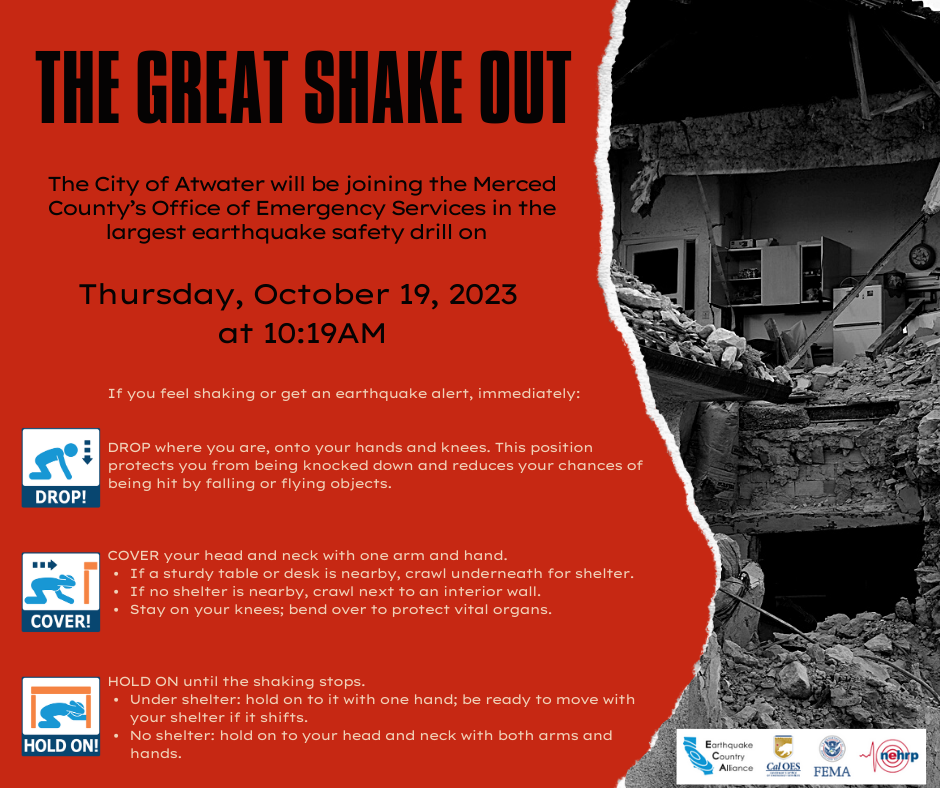 The City of Atwater will be joining the Merced County’s Office of Emergency Services in the largest earthquake safety drill on Thursday, October 19, 2023 at 10:19am. Please see more…