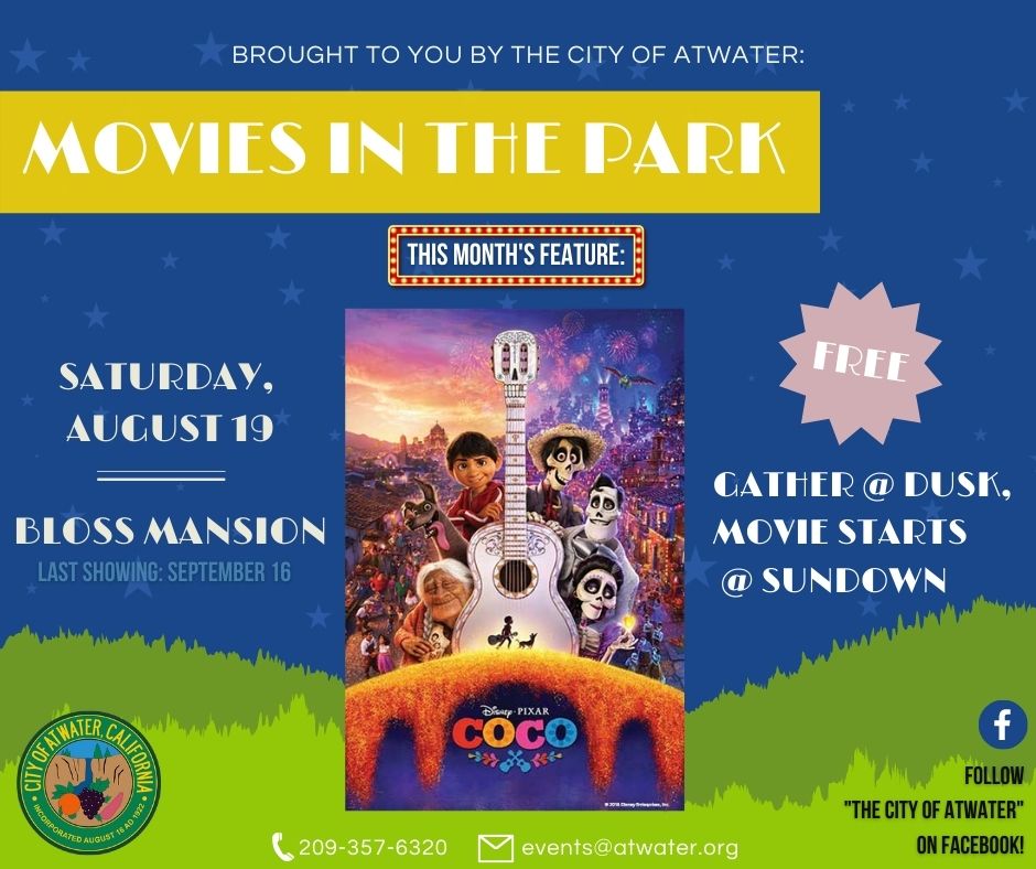 Come join us for Movies in the Park, tomorrow (August 19th) at the Bloss Mansion. Our feature this month is Coco. See flyer below for more details!!